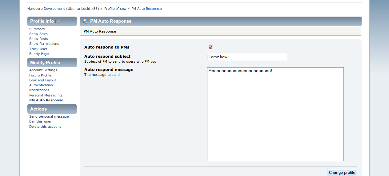 This mod is something similar to a vacation responder in that it sends a PM to a user who sent a PM. The message and subject are customisable, so the auto PM can be totally unique.